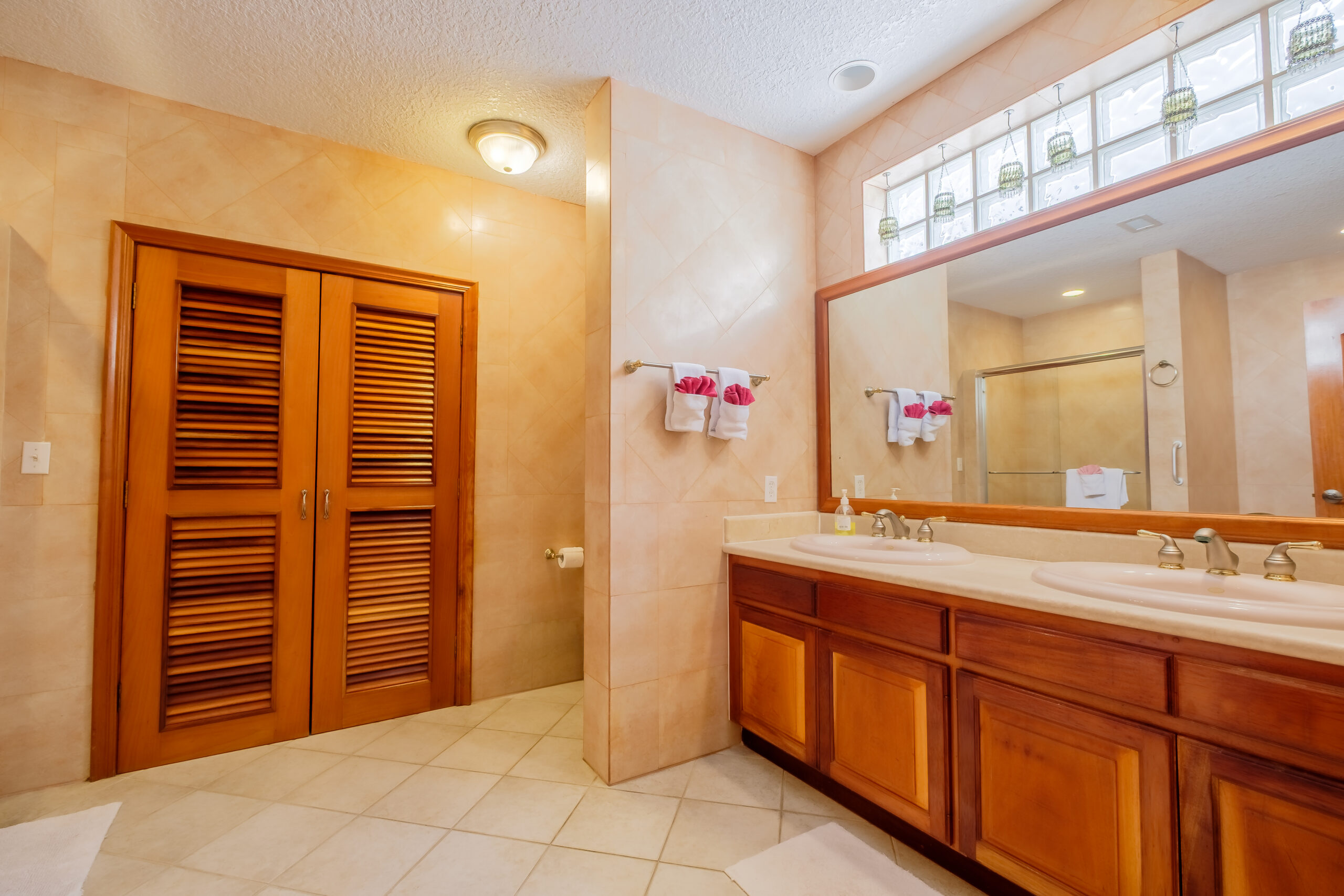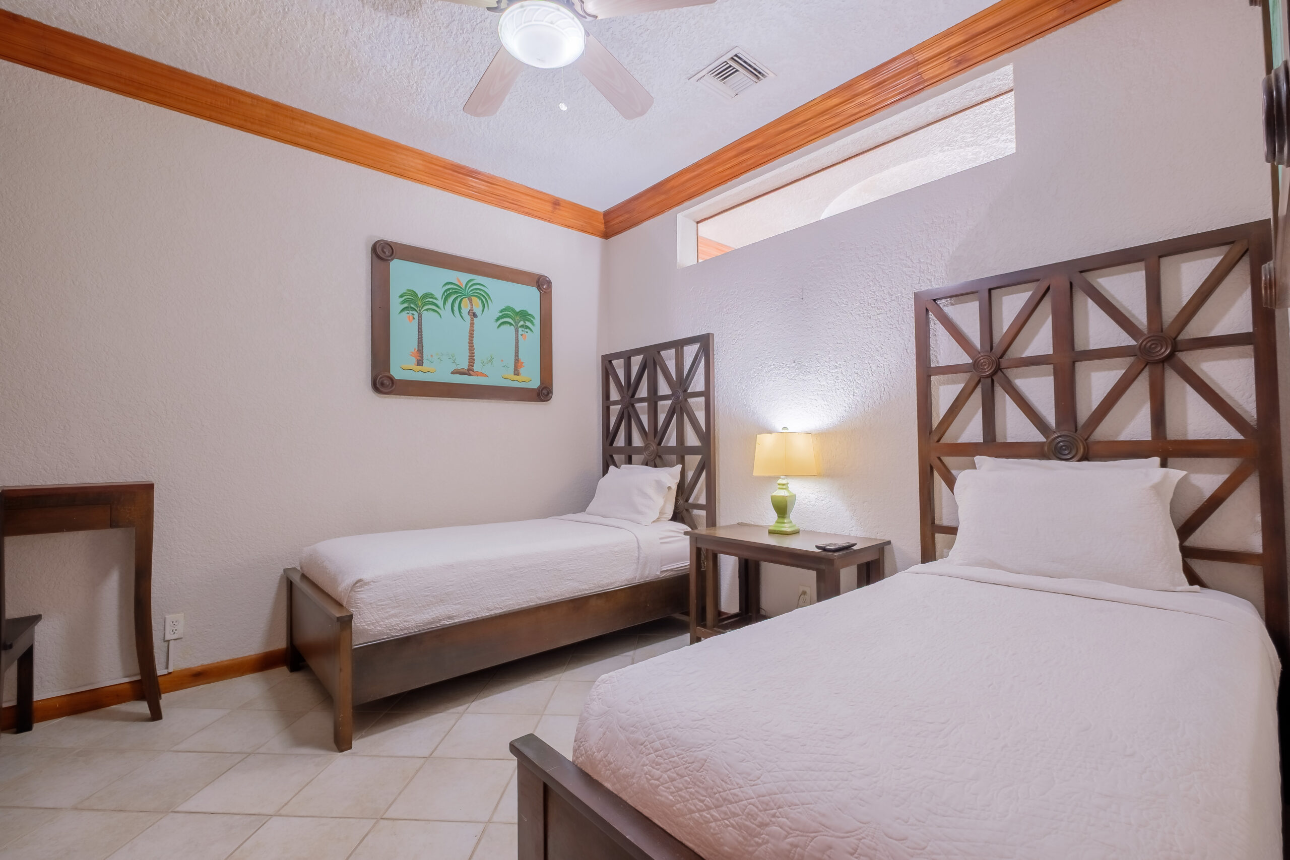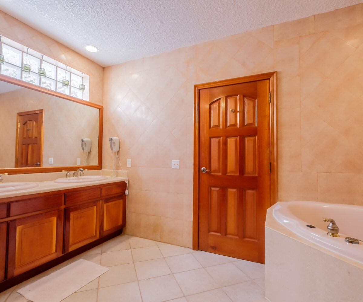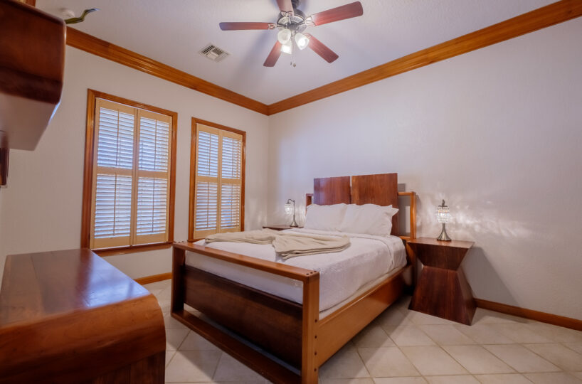 The home includes three bedrooms arranged to accommodate both families and groups. The main bedroom is set with a king-sized bed and features an en suite bathroom equipped with a jacuzzi, providing a more private and comfortable space within the home. The second bedroom includes a queen-sized bed, while the third bedroom is fitted with two single beds, offering flexibility for guests or children. The second bathroom is easily accessible from the common areas and additional bedrooms.