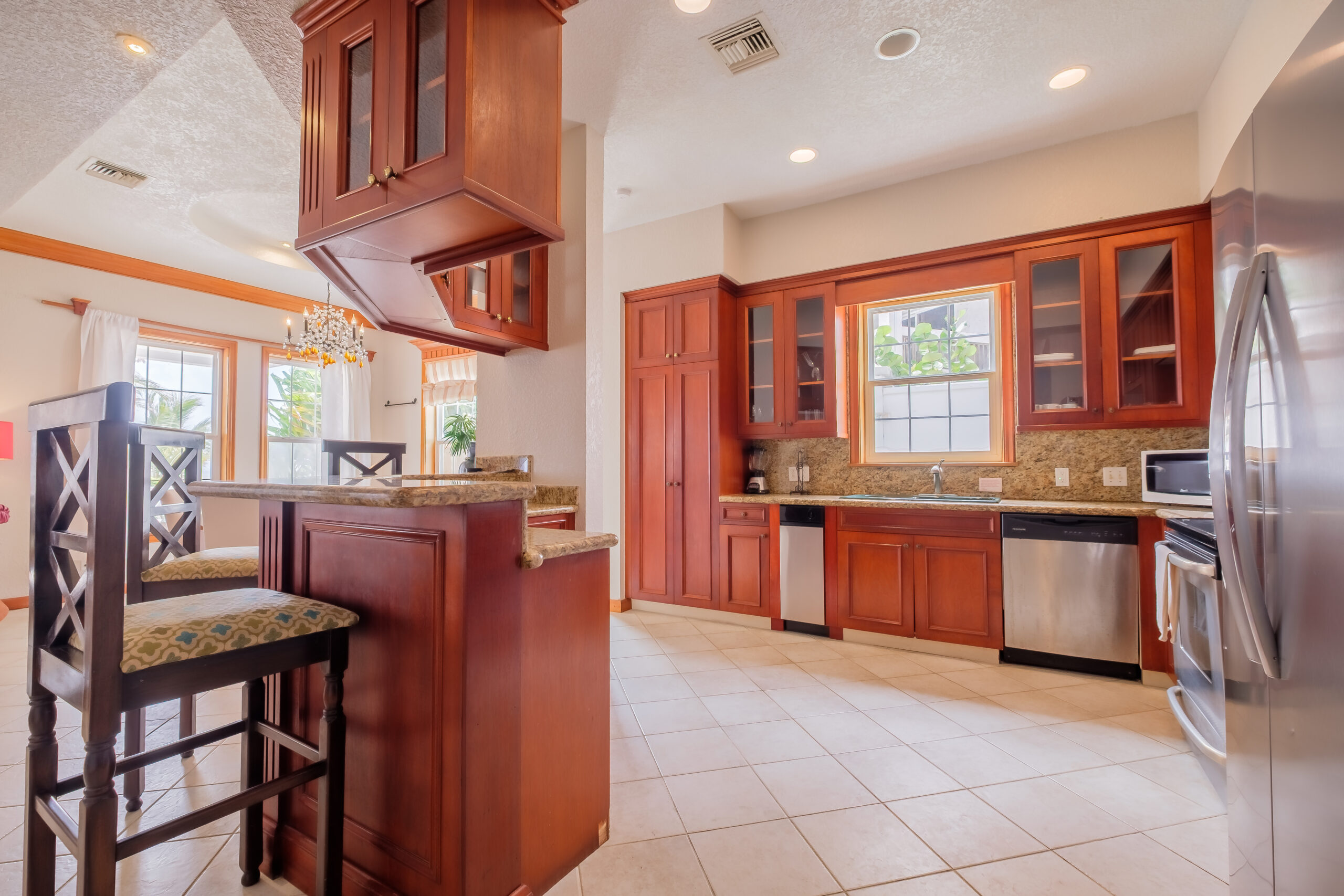 The kitchen is fully equipped with ample storage and workspace, making it suitable for extended stays or regular use. Natural light runs throughout the unit, with large openings that bring in the sea breeze and keep the space feeling open and connected to the outdoors.