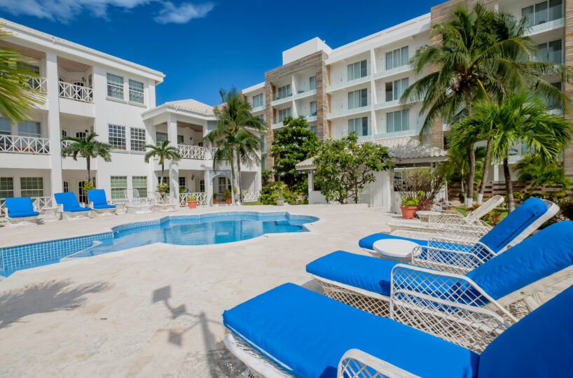 This first-floor 2-bedroom, 2 bath (one ensuite, one in hall, both have tub showers) living room and kitchen unit has great views of the pool, beach, and Caribbean. Both bedrooms have queen beds. There is a queen futon in the living room. This unit sleeps 6. This unit is on the first floor of a three-story building. There is a small patio overlooking the ocean.
